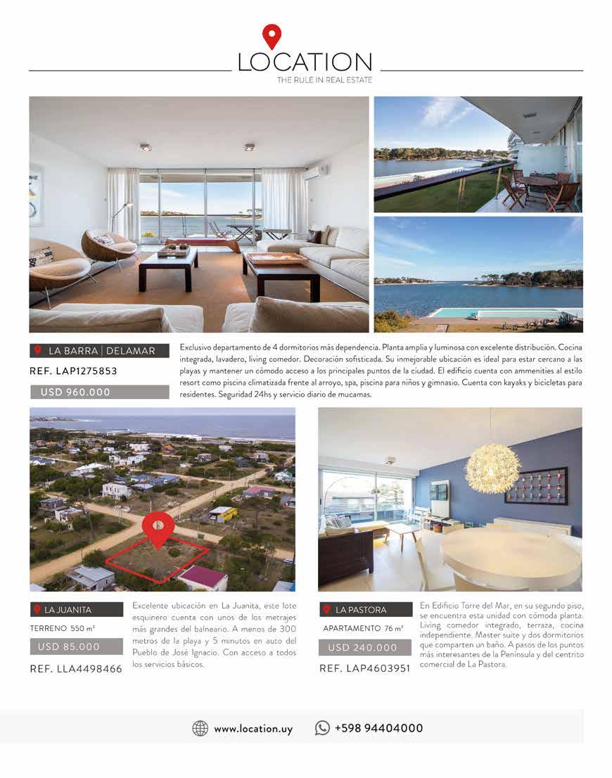 25 Viví Punta DENISE PESSANA (OPERADOR TURÍSTICO N° 1557) dp@dreamprop.net | www.dreamprop.net [[+598] 95 117 888 Del Arq. Lucio Gernaert Willmar, en 2 plantas, con grandes galerías para disfrutar con amigos y en familia. PA: master suite con vestidor y gran playroom con escritorio y terraza. PB: Suite de huéspedes y 2 dorm. con baño. Terreno excepcional de 4.600 m2 a dos cuadras de Laureano Alonso Pérez. Amplias posibilidades. Casa principal de 4 dormitorios. Casa de caseros de 2 suites. Totalmente cercado. Portón automatizado. Una casa impecable en cada detalle. Amplia recepción con salida a galería y jardín. 3 suites más dep. servicio. Cocina con living íntimo. Jardín muy disfrutable con amplia galería con living, comedor y parrillero. Garaje automatizado para 2 autos. En Rincón del Indio, ideal para vivir todo el año. 4 dormitorios, 3 en suite. Linda recepción con salida a galería y parrilla. ¡Una casa hermosa! USD 1.100.000UNA CASA EXQUISITA RODEADA DE VERDE USD 750.000BARRIO CERRADO / PRECIO REBAJADO: USD 1.200.000 USD 550.000OPORTUNIDADRINCÓN DEL INDIO USD 220.000EXCELENTE PARA INVERSIÓN USD 145.000EXCELENTE UBICACIÓN En el corazón de la península, hermosa vista. 1 dormitorio y medio. Impecable.Muy cerca de la península. Edificio nuevo, 2 dormitorios. Garaje. Amenities. USD 625.000SILENTE ¡NUEVO PRECIO! USD 480.000TIBURÓN 2 Espectacular recepción. 3 dormitorios (suite principal con vista al mar), 3 baños completos. Cocina con comedor diario. Dependencia y lavadero. Garaje. Pent-house de 2 suites más dependencia. Gran terraza y parrilla. Cocina. Toilette. Garaje para 2 autos. Los mejores servicios para disfrutar vacaciones inolvidables. Follow us! @puntaforsale_