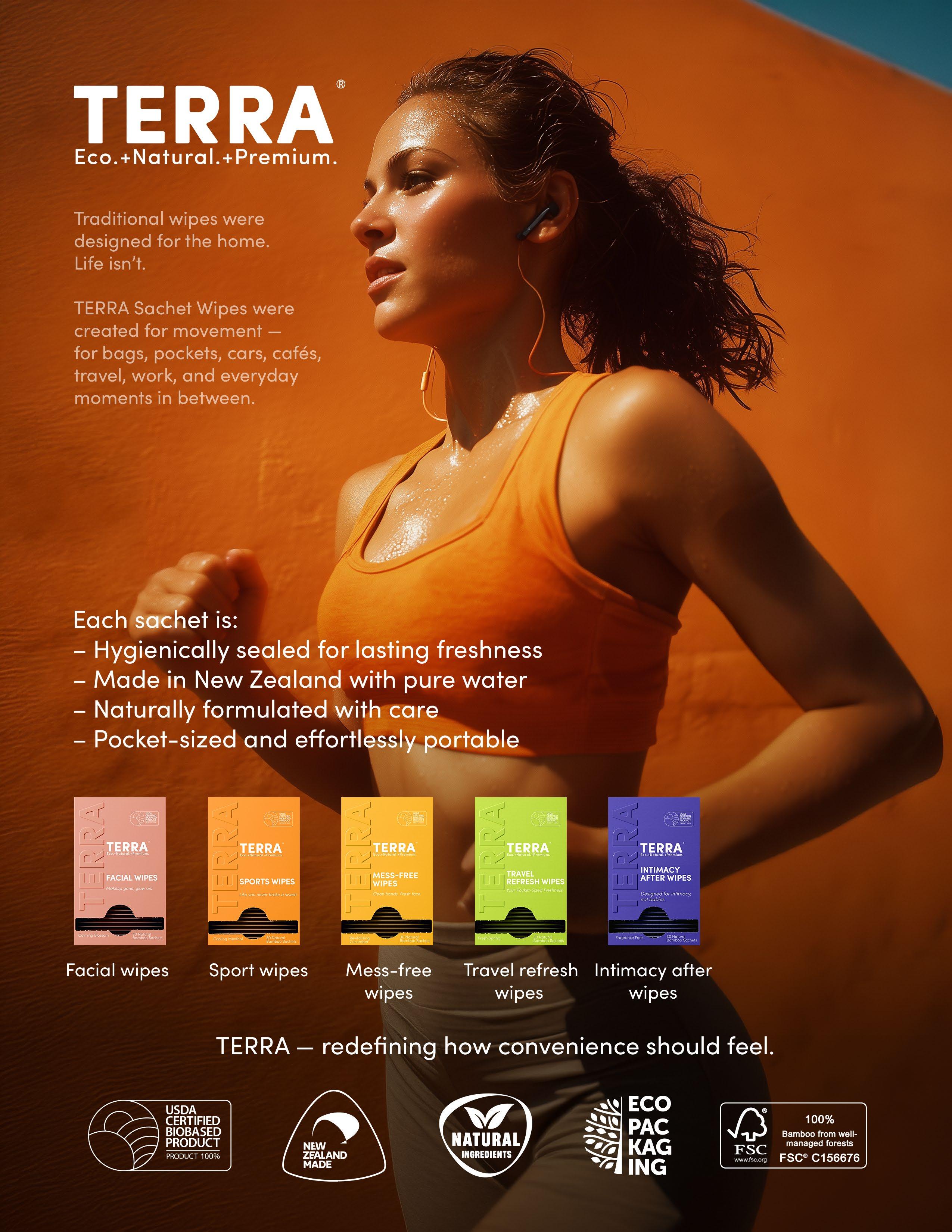 Terra is a modern, eco-conscious lifestyle brand redefining convenience through premium and portable bamboo wipes designed for the busy, efficiency-driven lives. Made in New Zealand Terra's single-sachet wipes offer stylish, pocket-sized freshness across multiple occasions-from skincare and baby care to outdoor, pet, and intimate care. Driven by strong consumer insights and high purchase intent, Terra blends thoughtful design with sustainability to deliver a clean, simple, and always-ready solution that empowers consumers to feel fresh and confident wherever life takes them. Terra est une marque moderne et eco-responsable qui revolutionne le confort grâce à ses lingettes en bambou haut de gamme, pratiques et faciles à transporter, conçues pour les vies actives et efficaces. Fabriquees en Nouvelle-Zelande, les lingettes Terra en sachets individuels offrent une fraîcheur elegante et compacte pour de multiples occasions : soins de la peau et de bebe, activites de plein air, soins des animaux et hygiene intime. Forte d'une connaissance approfondie des consommateurs et d'une forte intention d'achat, Terra allie design reflechi et durabilite pour proposer une solution propre, simple et toujours prête à l'emploi, permettant à chacun de se sentir frais et confiant en toutes circonstances.
