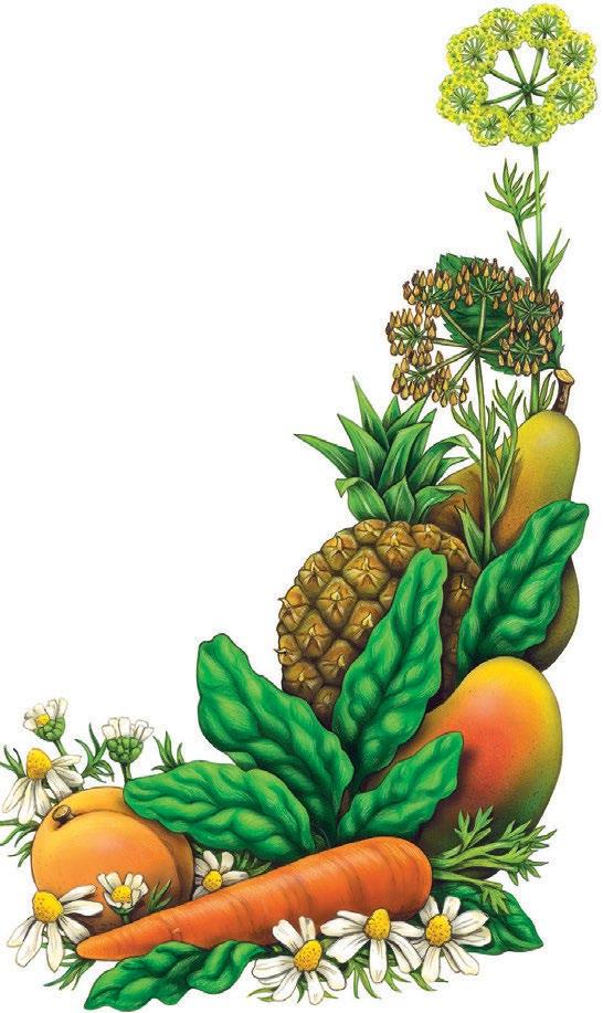 Extrait aqueux de plantes (de camomille, fenouil, écorce d’orange amère, carotte, épinard), eau, miel, jus d’ananas concentré, jus de poire concentré, purée de mangue concentrée, puree d’abricot concentrée, extrait de caroube, jus de mangue concentré, jus d’abricot concentré, arômes naturels, jus de citron concentré, acide ascorbique (antioxydant), extrait de pomme.