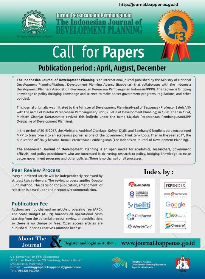 The Journal of Indonesia Sustainable Development Planning (JISDeP) is a journal published by Centre for Planners' Development, Education, and Training (Pusbindiklatren), Ministry of National Development Planning/National Development Planning Agency Republic of Indonesia (Bappenas) and supported by Indonesian Development Planners Association (PPPI).