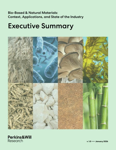 This executive summary distills insights from two companion reports on Bio-Based and Natural Materials, available on our website: Context and Applications in Architecture and a State-of-the-Industry Survey. It provides a consolidated overview of current opportunities and challenges shaping the use of bio-based and natural materials. This summary highlights the environmental and cultural motivations for shifting toward biological and regenerative material systems and introduces the taxonomy, technological readiness, and sourcing and design considerations found in the Context and Applications report. It also synthesizes key market signals and barriers identified through the State-of-the-Industry Survey’s literature review, interviews, and analysis. Together, these insights offer a clear starting point for understanding the current landscape of bio-based materials, outlining near-term specification opportunities as well as areas where advocacy, strategic investment, and pilot projects can accelerate broader adoption in the built environment.