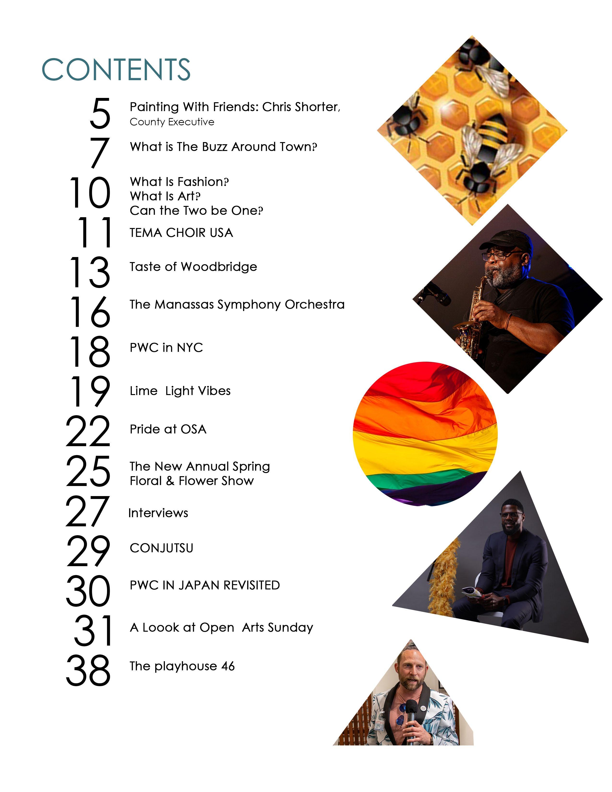 Is Art? Can the Two be One? 9| Tema Choir USA 11| Taste of Woodbridge 14| The Manassas Symphony Orchestra 16| PWC in NYC 17| Lime Light Vibes 18| Raise the Stage 20| Pride at OSA 23| The New Annual Spring Floral and Flower Show 24| Spring Floral Exhibit 25| Interview With Otis Banks The Original Limelight Interview with Jane Marx 26| What Little Island Can Teach Us About Place Making 27| The Growing Anime and Gaming Community in PWC 28| PWC In Japan Revisited 29| A Look At Open Arts Sunday 36| The Playhouse 46