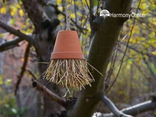 6. Hang de pot op z’n kop aan een boomtak , in een struik of op een ander beschut plekje in de tuin. Zorg ervoor dat de oorworm er makkelijk in kan kruipen.
