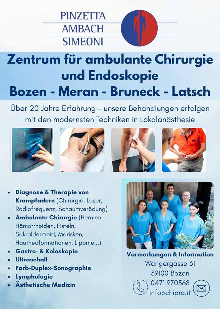 Sitz, Redaktion und Verwaltung: Oberragen 18, 39031 Bruneck, Tel.: 0474 550 830, E-Mail: info@pz-media.it Egtr. Trib. BZ Nr. 23/89 v. 2.10.1989 Internet: www.pz-media.it; Einzelnr.: 1,00 Euro; Jahresabo: 25,00 Euro; Erscheinung: 14-täglich; Verantw. Direktor: Reinhard Weger (Chefred.); Sekretariat: Michaela Huber; Akquisition: Hans Paulmichl, Josef Tasser; Redaktion: dott. Reinhard Weger, MA; Dr. Willy Pöder; Dr. Judith Steinmair; Dr. Verena Duregger; Monika Gruber; Barbara Pöder; Dominik Faller; Alexander Dariz; Grafik: Andreas Rauchegger, Kerstin Voigt; Herausgeber: Pustertaler Medien GmbH - Oberragen 18, 39031 Bruneck, Im PT-Abo vert. ROC-Nummer: 2717, ISSN 2532-2567 Mitglied der USPI (Unione Stampa Periodica Italiana) Druck: Athesia Druck, Bozen – PEFC-zertifiziert: Dieses Produkt stammt aus nachhaltig bewirtschafteten Wäldern, Recycling und kontrollierten Quellen; PZ-WhatsApp Nummer: 371 7678970
