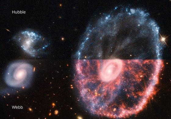 "Any way you slice it, the Cartwheel Galaxy is magnificent to behold. The top half of this image shows the galaxy as seen by NASA's Hubble Space Telescope in visible light, while the lower half of this image shows the James Webb Space Telescope's infrared view. Hubble and Webb will continue to work together to provide complementary views of the universe."