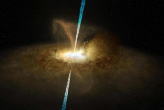 This illustration shows what the core of Messier 77 might look like As other active galactic nuclei, the central region of Messier 77 is powered by a black hole that is surrounded by a thin accretion disc, which itself is surrounded by a thick ring or torus of gas and dust. In the case of Messier 77, this thick ring completely obscures our view of the supermassive black hole This active galactic nucleus is also believed to have jets, as well as dusty winds, that flow out of the region around the black hole perpendicularly to the accretion disc around it.