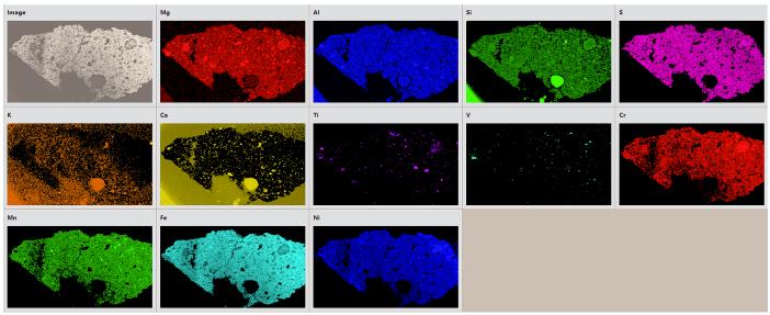 Micro-spot energy dispersive X-ray fluorescence spectroscopy was employed to produce hyperspectral XRF images of the distribution of the primary elements identified in the Murchison meteorite sample. Under the analysis conditions employed, the observable elements were: Mg, Al, Si, S, K, Ca, Ti, V, Cr, Mn, Fe and Ni.