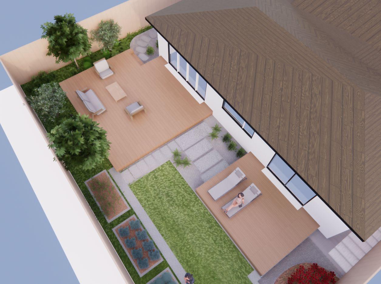 The design also includes two wooden decks—one extending from the living room for social use, and a more private one adjacent to the master bedroom for quiet retreat. To address drainage challenges caused by elevation differences with the neighboring property, a central French drain was integrated into the layout to ensure proper water management.