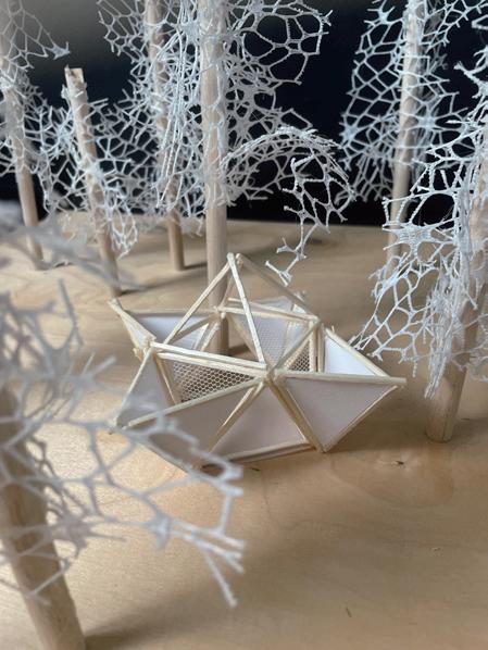In this model, carbonized wood presents a natural texture and enhances weather resistance; gauze net and twine are breathable and layered, making the space balanced between shelter and permeability.