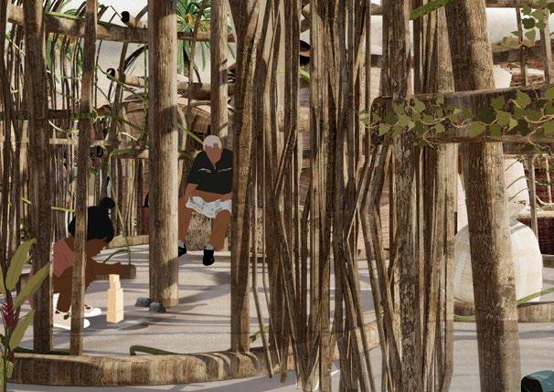 design :The whole design is open, and people can move around the whole space. Three curtain covered rooms are set up in the middle, mainly for massage, and three-foot baths are set up outside, respectively for adults, the elderly and children, each foot bath can accommodate about 8 people. People can chat and enjoy the scenery while taking a foot bath. material:The whole material is made of concrete, which makes the structure more stable and supportive. For the material of the floor, added small stones to smooth it down to form a more distinctive floor.