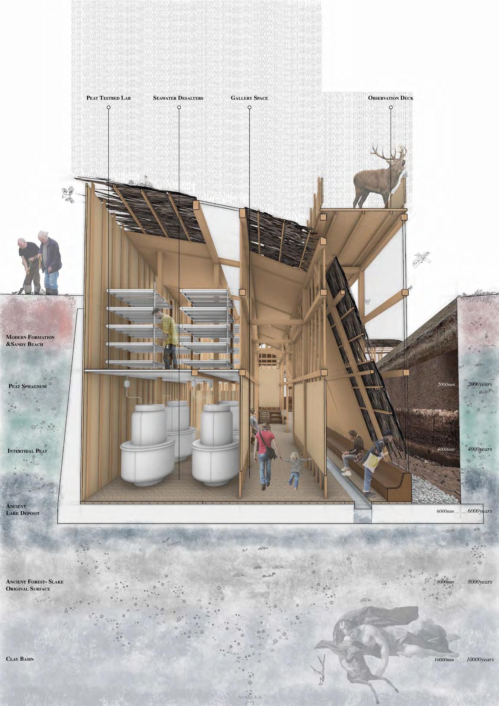 The building aims to generate environmental awareness and civic responsibility by creating a spatial experience sequence to appreciate the peatland’s vast temporal breadth and establish a dialogue with the archaeological remnants; it also has the facility and space for peat bog researchers to restore the damaged peatland. People can have a face-to-face experience with peat when they go down to the gallery space.