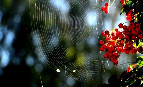 In de tuin: een spinnenweb en de felrode bessen van de vuurdoorn; beide tekenen van de herfst Foto: Jaap van Willegen