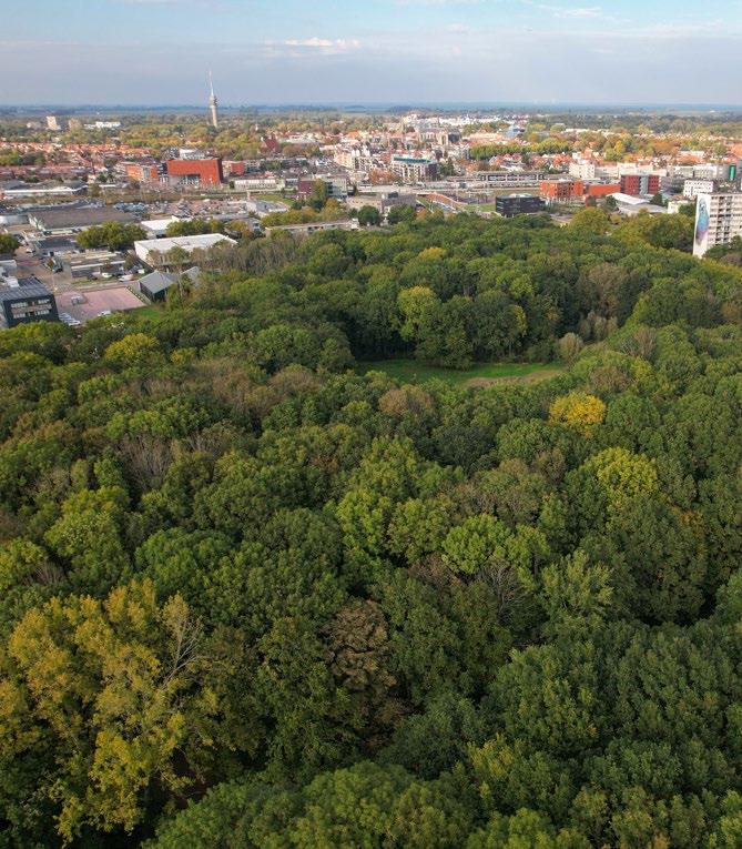 “Rijdend door Goes merkte ik dat de herfst al goed zichtbaar begint te worden. Sommige delen zijn al bruin en oranje, maar het groen overheerst nog. Daar komt vast snel verandering in. Het contrast tussen het groen, de gebouwen en woonhuizen is goed te zien op deze foto van bovenaf. Meteen viel de bekende duif op het flatgebouw op. Eigenlijk bekijken wij deze foto nu door de ogen van een echte duif, die boven Goes vliegt.”