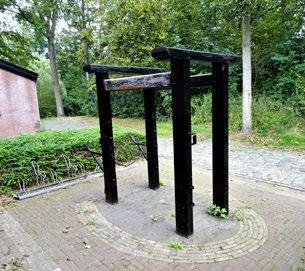 Een beetje verstopt achter het ambachtencentrum op het terrein van de Hollandse Hoeve, staat deze travalje. Weliswaar is die niet meer helemaal compleet, een paard zou er zo doorheen kunnen lopen, maar op deze plaats blijft het oude ambacht van hoefsmid zichtbaar. De stratenmaker heeft in de bestrating van gekleurde stenen een hoefijzervorm gelegd. Daar is in ieder geval aandacht aan besteed!