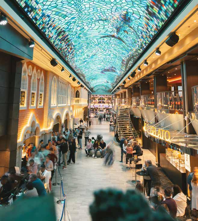 Luxe aan boord van de Euribia betekent vooral ook genieten. De Galleria Euribia vormt het sociale hart van het schip. Deze 112 meter lange overdekte promenade is uitgerust met de langste LEDkoepel op zee, een licht- en kleurenspel dat de sfeer van een exclusieve winkelboulevard combineert met die van een futuristisch theater. Hier bevinden zich restaurants, boetieks en lounges waar gasten kunnen flaneren terwijl de oceaan langzaam voorbijglijdt aan de ramen. ‘s Avonds transformeert de promenade tot een levendig centrum van muziek, licht en elegant vermaak.
