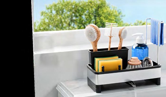 No more messy benches or soggy sponges. This space-saving Sink Organiser keeps your sponges, scourers, and brushes, upright, dry, and organised. Made from rust-resistant stainless steel, with an autodrain base and dish-cloth airer – it keeps your kitchen tidy, organised and hygienic.