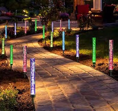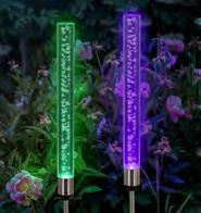 Spectacular Solar Bubble Wands feature light-up acrylic tubes filled filled with static bubbles that reflect and illuminate colour as they cycle through a rainbow of hues. The unique slimline design stands tall and elegant, adding a designer lighting effect to garden beds, pathways, and pot plants, without any wiring or power bills. With integrated solar panels, they charge by day and glow automatically every night. Measures 62.5cm total height; bubble wand section is 23cm x 2.5cm diameter.