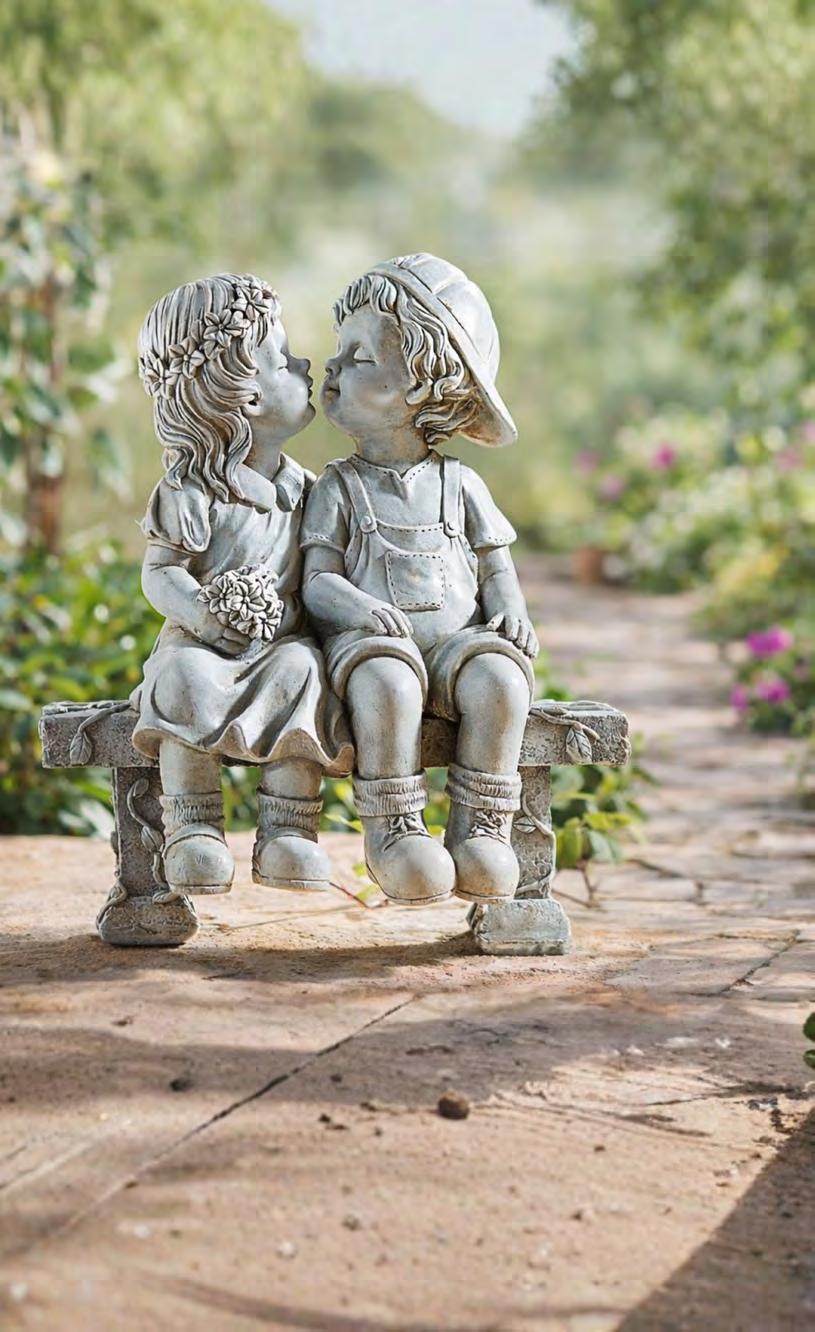 With lifelike detail and old-fashioned charm, this weatherproof resin statue brings warmth and nostalgia to your patio or garden bed. Perched side-by-side on a classic stonelook bench, the sweet boy in cap and girl with flowers gaze toward each other, lips about to meet. It’s a delightful way to evoke cherished memories, celebrate love, and share smiles with family and guests. Measures 21cm tall x 19cm wide x 10cm deep.