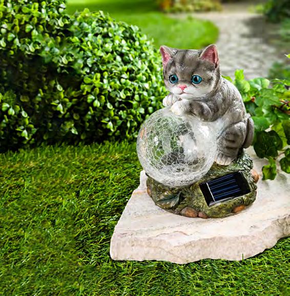 This caring mother duck carries her two newly hatched chicks, glowing gently beneath the evening sky. The frosted glass orb charges during the day and illuminates at night with 10 warm white LEDs, guiding your way or highlighting your favourite spot – warming hearts and spreading love by day and by night. It’s made from weather-resistant resin and measures 18x13x19cm.