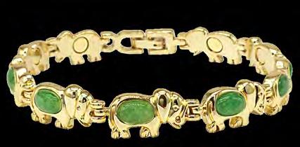 Featuring stunning jade cabouchon stones and a circle of linked elephants with raised trunks and tails; this delightful goldtone bracelet symbolises strength and good luck while attracting harmony and prosperity. Magnets are discreetly built in to support wellness and promote a sense of balance. Crafted from hypoallergenic alloy, it makes a thoughtful gift or a meaningful treat for yourself. Measures 17.8cm. $22.95