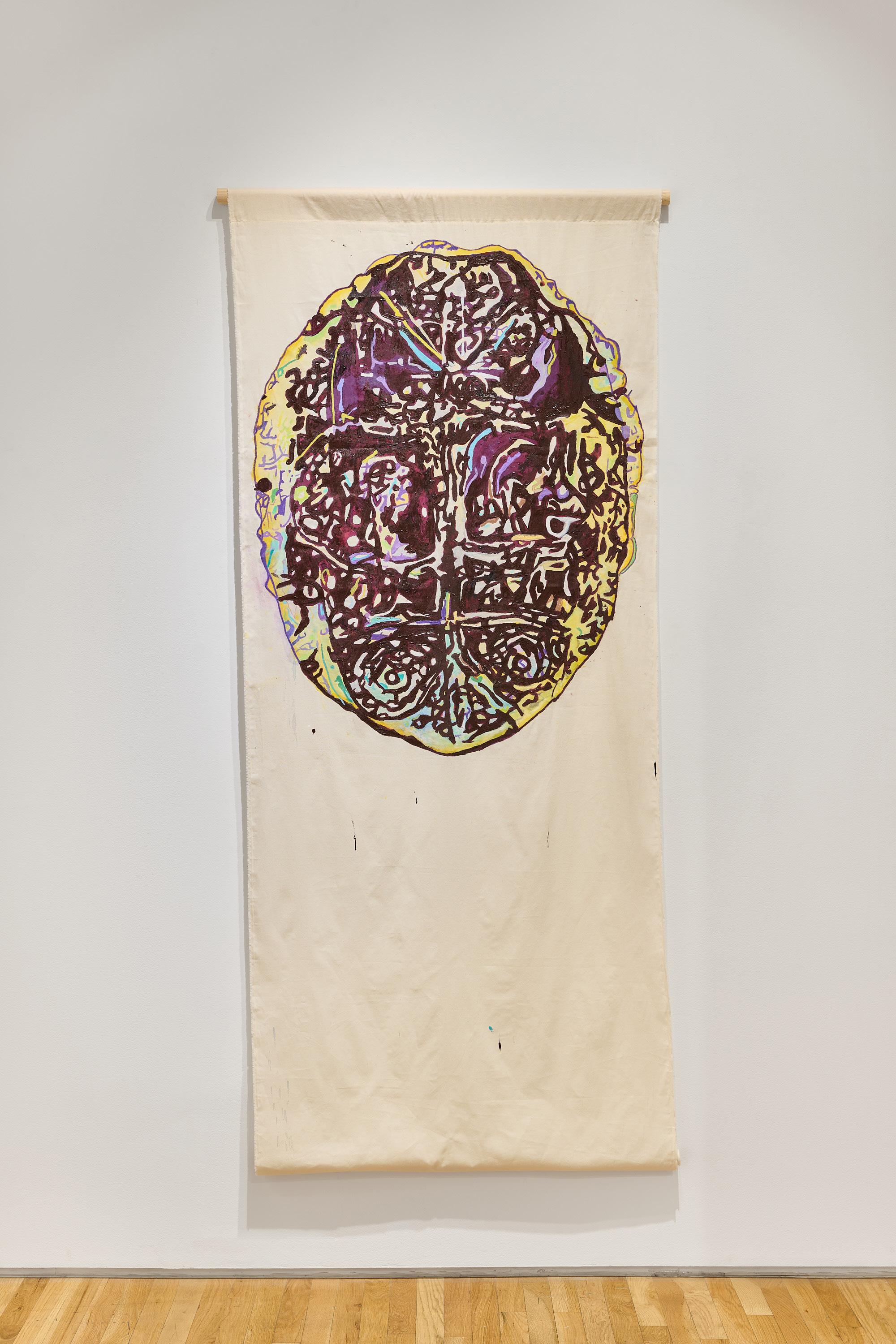 Galindo’s work references the tortoise’s many meanings as a recurring archetype across cultures and time periods. For example, Galindo was inspired by the Shang Dynasty-era practice of “plastromancy,” a form of divination using turtle shells that was practiced in ancient China. In the “scutes” – the individual growth plates on the plastron that can be used to calculate the tortoise’s age, similar to a tree ring – Galindo has interpreted and decoded a portrait of the sentient entity within the shell, giving it visibility in his paintings. The natural seams and patterns of the shell are akin to the symbols of music notation in Galindo’s practice: signifiers of meaning within systems of visual iconography.