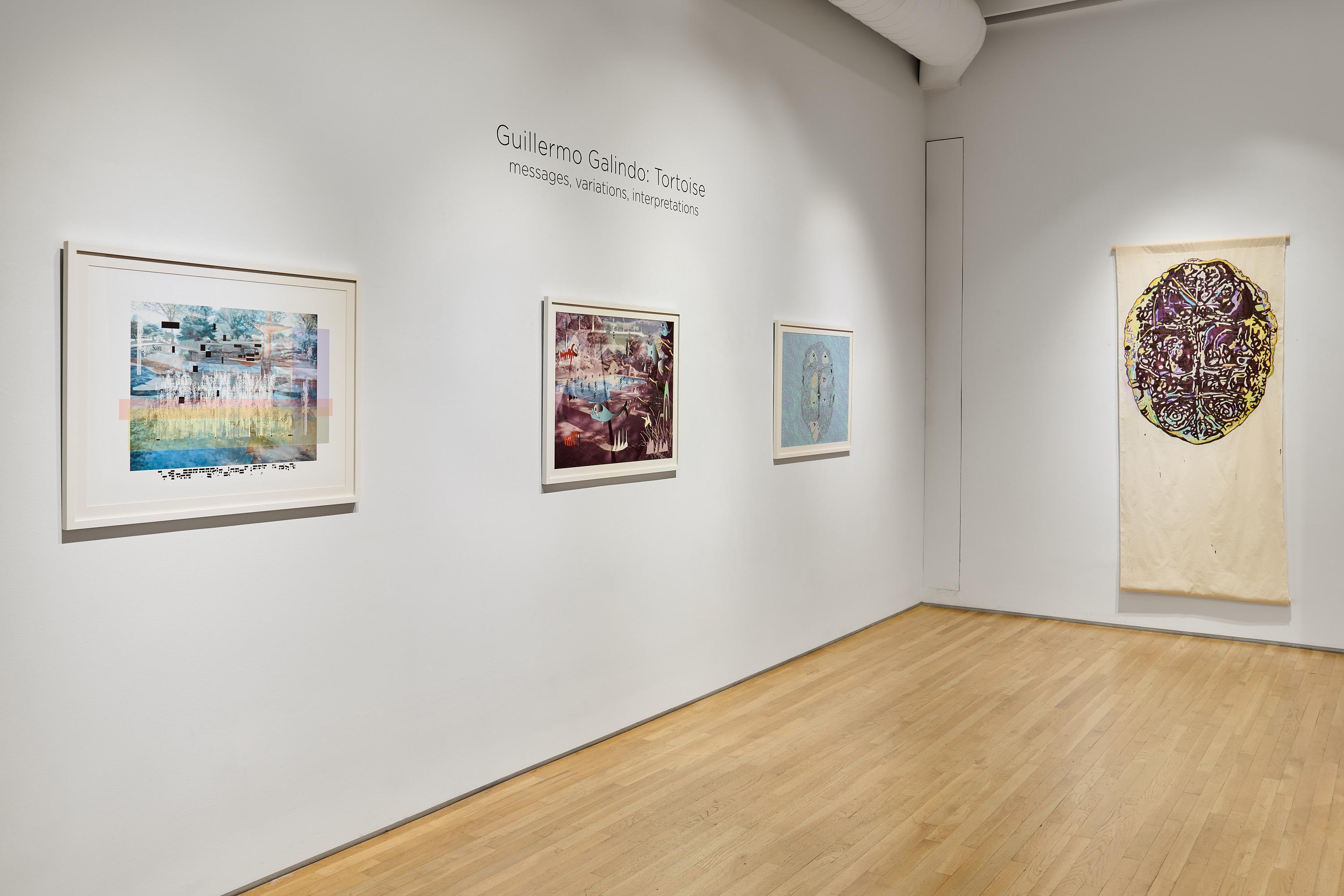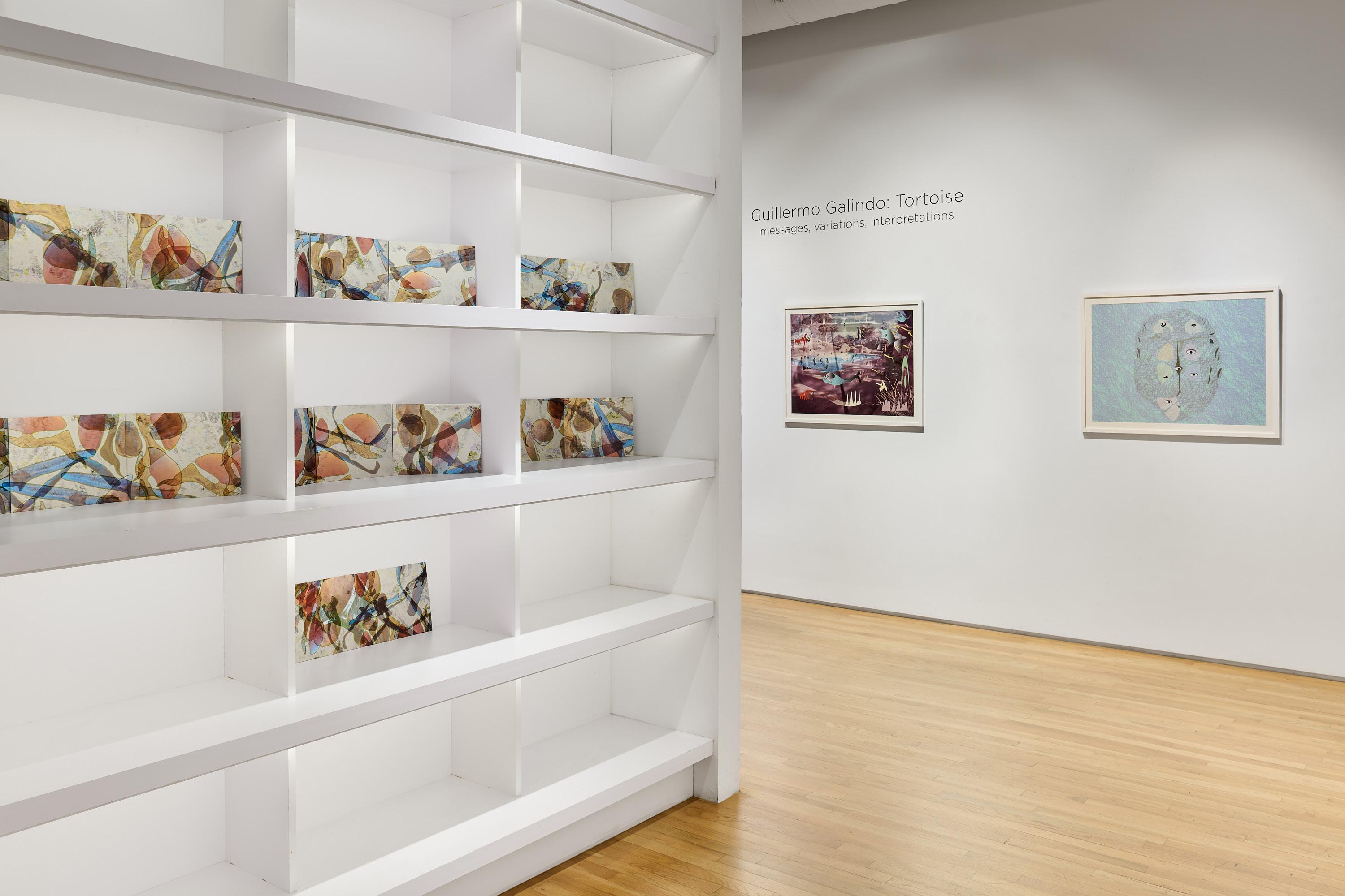 Tortoise is anchored by Galindo’s investigation of tortoises as symbols of migration, intuition, longevity, and wisdom, contextualized by his longstanding interest in border constructs. Fascinated by the tortoise’s unique capacity to navigate between land and water and to reorient to its birthplace, Galindo views the tortoise as a type of universal clock through which events are eternally synchronized. Tortoises exemplify Carl Jung’s theory of transcendent function, in which the psyche is able to reconcile forces of opposition between the unconscious and conscious realms. The confluence of physical memory, as in the tortoise’s ability to use the Earth’s magnetic field as a geolocator, and temporal memory, as in the natural grooved patterns of the tortoise’s lower shell (the “plastron”), can be felt in Galindo’s paintings of tortoise shells. Both Galindo’s paintings and the double-exposure photographs refer to the two tortoise shells that he found in the desert of New Mexico as a Roswell-artist-in-residence.