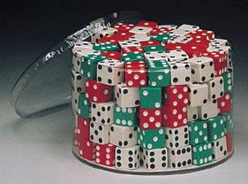 Enough red, green and white dice for board games, sorting and more. Standard size 1.5cm cubes are easy to toss and read. Includes storage drum.