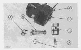 9. Remove piston rings and clean the ring grooves in piston (12) with a piece of hard wood.