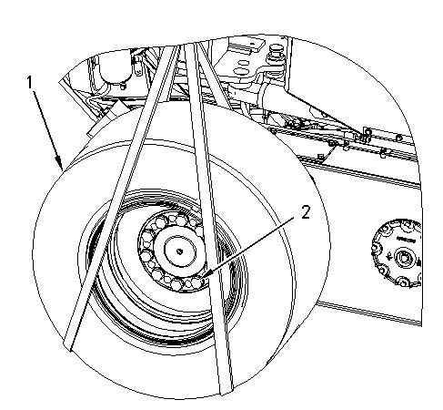 1. Attach a suitable lifting device to wheel (1). Install wheel (1). The weight of wheel (1) is approximately 272 kg (600 lb). Install bolts (2). Tighten bolts (2) to a torque of 700 ± 90 N·m (516 ± 66 lb ft).