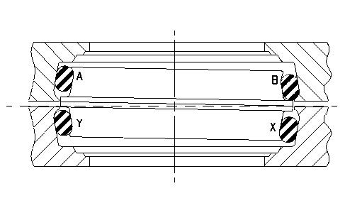 Illustration 15 shows the same seal after the lower housing has rotated 180 degrees. In this position, there will be high pressure at point (B) and at point (X). These points of high pressure may result in galling of the toric rings. There will be low pressure at point (A) and at point (Y) which will result in possible leakage.
