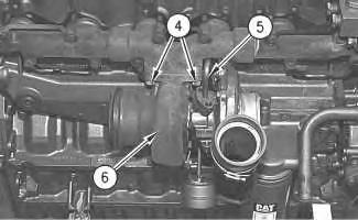 3. Position the turbocharger gasket and turbocharger (6) on the exhaust manifold. Install nuts (4) and tighten nuts (4) to a torque of 54 ± 5 N·m (40 ± 4 lb ft).