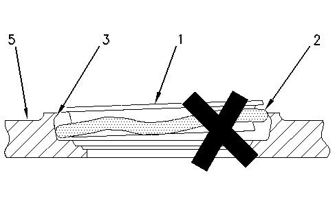 Note: Rubber toric ring (2) must never slip on the ramps of seal ring (1) or the ramps of seal ring housing (5). In order to prevent slippage, allow adequate time for evaporation of the lubricant before proceeding with the procedure. Once the rubber toric ring is correctly positioned, the rubber toric ring must roll only on the ramps.