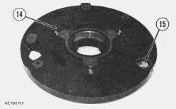 41. Install three 3/8"-16NC forcing screws (54) and loosen retainer (53) from housing. Remove the retainer and shims. Put identification on shims for use during assembly.