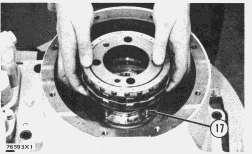 16. Put the cam and cage assembly of the one-way clutch in position in housing. Make sure the cage assembly is in correct position on the dowels (17) in turbine.