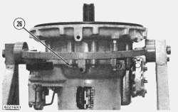 18. Remove the two bolts (25) and the bolts (26) that fasten the torque divider housing to the torque converter housing.