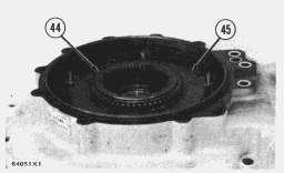 34. Remove the two bolts (45), shims, seal, and output flange (44) from the shaft. Put identification on the shims for use during assembly of transmission.