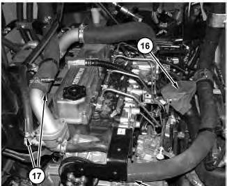 11. Install duct (16) . Connect hoses (17) and (18) .