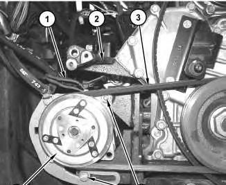 26. Position air conditioner compressor (4). Install belt (3) and install bolts (5). Refer to Operation and Maintenance Manual, "Belts - Inspect/Adjust/Replace".