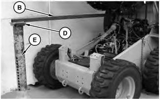 1. Install trolley (C) onto tube assembly (B). Attach tube assembly (B) to the machine. Tube assembly (B) will attach to the machine at the location of the bracket for the hydraulic tank. Position the other end of tube assembly (B) and base (D) onto Tooling (E) .
