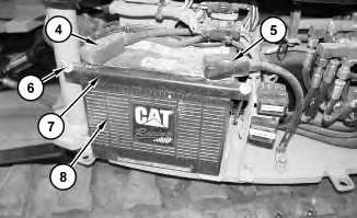 3. Disconnect negative cable assembly (5). Disconnect positive cable assembly (4). Remove nuts(6). Remove bracket (7) and battery (8).