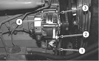 2. Loosen bolt (1), bolt (2), and bolt (3). Slide the alternator toward the engine and disconnect the alternator V-belts.