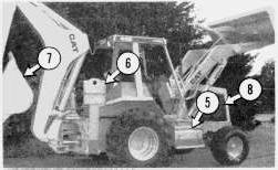 Battery compartment (5), stabilizer (6), backhoe bucket (7) and radiator (8).