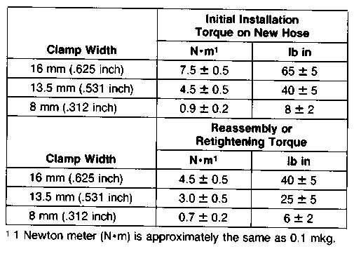 Thefollowingchartgivesthetorquesforinitialinstallationofhose clampsonnewhoseandforreassemblyorretighteningofhoseclamps onexistinghose.
