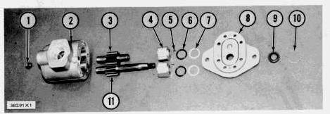 5. Lift the drive shaft and gear assembly (11) and the idler gear and shaft assembly (3) out of the body of the pump.