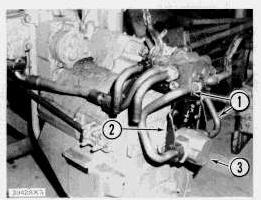 5. Remove bolts (1), locks (2) and retainer (3) to remove the accessory drive housing (4) and fuel filter base from the engine as a unit.
