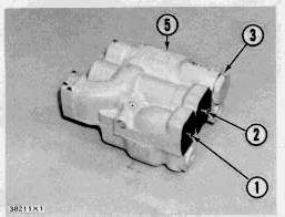 Oil to supply the supplemental circuit goes in inlet (3) to fill the manifold along the top of the valve. Two passages inside the valve make connections between the manifold and the bore for the reversing spool.