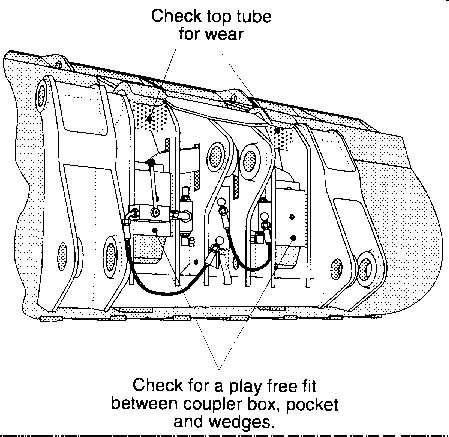 Applicationdictateswhencouplerrebuildingisrequired.Anexcessiveamountofplaybetween couplerandtheattachmentisanindicationthatwearhasoccurred.Thecoupler'stoptubematerialis designedtowearbeforetheattachment'shookcasting.