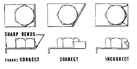 Flat metal locks must be installed properly to be effective. Bend one end of the lock around the edge of the part. Bend the other end against one flat surface of the nut or bolt head.