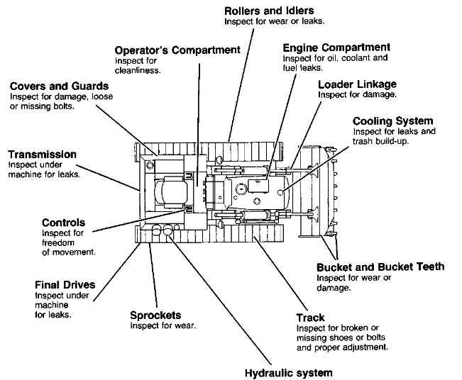 Foryourownsafety,andmaximumservicelifeofthemachine,athoroughwalk-aroundinspection shouldbemadebeforemountingthemachinetostarttheengine.Inspectaroundandundermachine forsuchitemsasloosebolts,trashbuild-up,lubricant,fuelorcoolantleaks,andconditionoftrack andimplements.