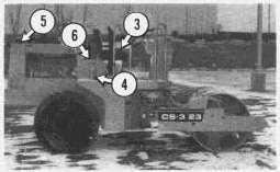Operator'scompartment(3),hydraulictank(4),radiator(5),andbattery(6).